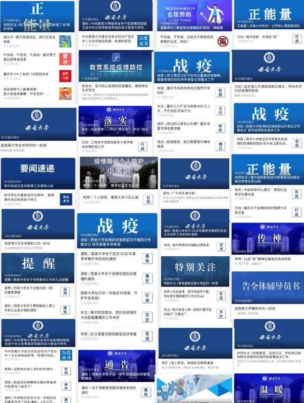 为全面做好新冠肺炎疫情防控特殊时期宣传工作,坚决打赢疫情防控阻击战,学校党委宣传部、党委网络工作部在学校疫情防控指挥部的统一部署下,充分利用官方网络新媒体矩阵,及时发布相关通知通告及防控工作安排,普及科学防控知识,挖掘一线师生“战疫”故事,引导广大师生员工理性应对疫情,在网上吹响“战疫”集结号。在不到一个月的时间里,学校官方微信共发布“战疫”相关推文65篇;官方微博推送疫情相关内容71条;官方抖音等视频平台共发布各类师生原创短视频15个。其中,官方微信通过搜集整理留校师生抗击疫情的真实事例,发布《请放心,我在betway88西汉姆联很好!》等系列推文,生动还原学校防疫工作启动以来师生携手共克时艰的点点滴滴;通过整合西大学子抗疫事迹,发布《我们是青年一代,我们想做更多!》等系列推文,展现每一个西大学子面对疫情时的责任与担当。官方微博发起网络接力“我承诺,防控疫情,有我”行动,吸引数千名师生参与,纷纷在微博留言,承诺以身作则,防控疫情。相关推文、微博引起师生、校友强烈反响,引起社会广泛关注,在网上凝聚了西大人抗击疫情的力量。