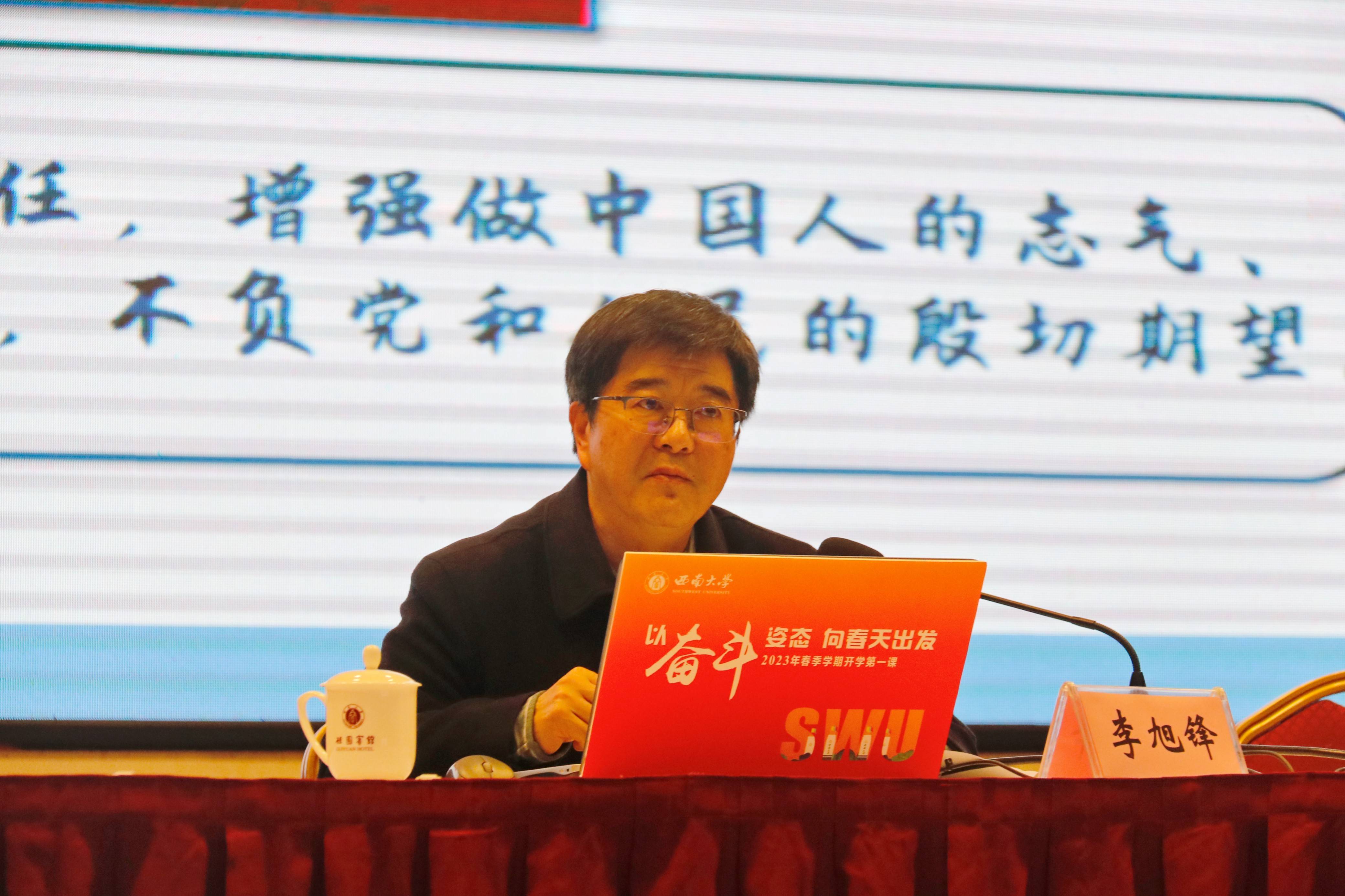 李旭锋指出:“融入时代,才能把握时代,每一代青年人都有自己的时代际遇,都要在所处的时代谋划人生、创造未来”,他希望青年学子对话时代,用事实涤荡迷雾与彷徨。面对世界百年未有之大变局、中华民族伟大复兴进入关键时期,国际国内挑战重重,青年学子要看得懂形势、树得起信心、担得起使命,让迷雾被涤荡、脚步更有力,意气风发迈上全面建设社会主义现代化国家新征程,以中国式现代化全面推进中华民族伟大复兴;传承精神,用担当交汇光荣与梦想。李旭锋从阐释精神之于民族和国家的重要意义入手,列举了中华民族的担当与气节、西大师生用行动诠释的伟大抗疫精神,希望同学们“从精神中汲取真理力量、实践力量、人格力量、智慧力量,传承红色基因,激扬精神的力量,继续奔跑,让担当交汇成为青春标识”;勇敢进取,用奋斗激扬青春与人生。李旭锋在讲述中展示了伟大祖国的强大实力,生发出背后奉献无悔青春的广大青年的励志故事,以此告诫青年学子“奋斗是青春最亮丽的底色,行动是青年最有效的磨砺”。