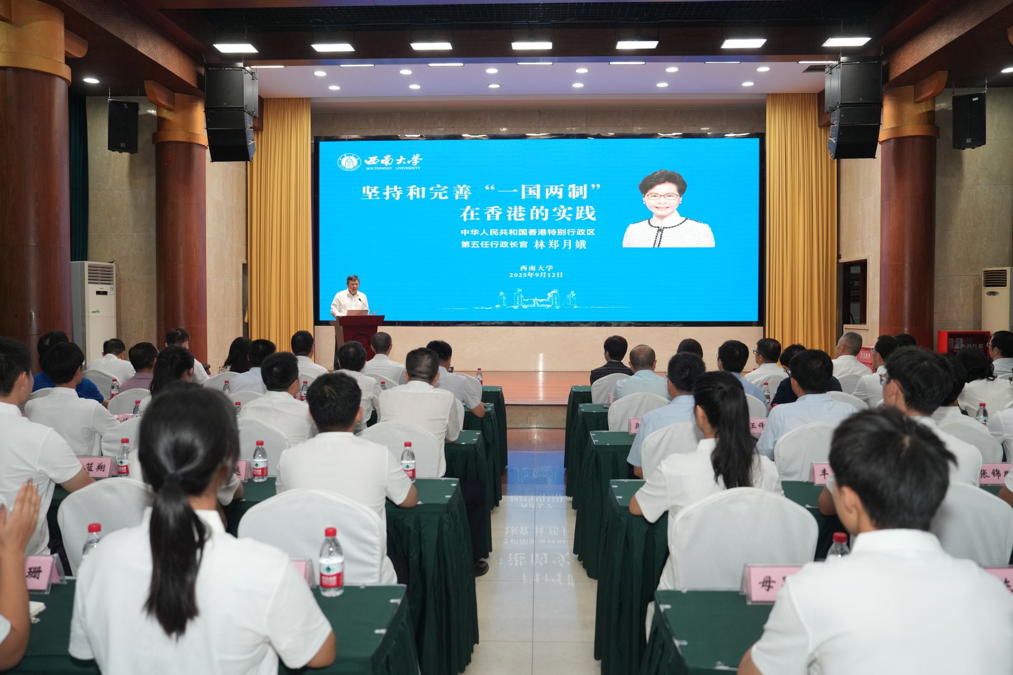 9月12日,香港特别行政区第五任行政长官林郑月娥女士到访学校,为师生代表作了题为《坚持和完善“一国两制”在香港的实践》的专题报告。党委书记张卫国主持。