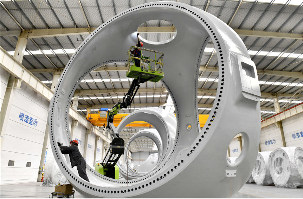在山东省惠民县风电装备产业基地涂装车间,工作人员对风电轮毂进行涂装(2022年6月7日摄)。新华社记者郭绪雷摄