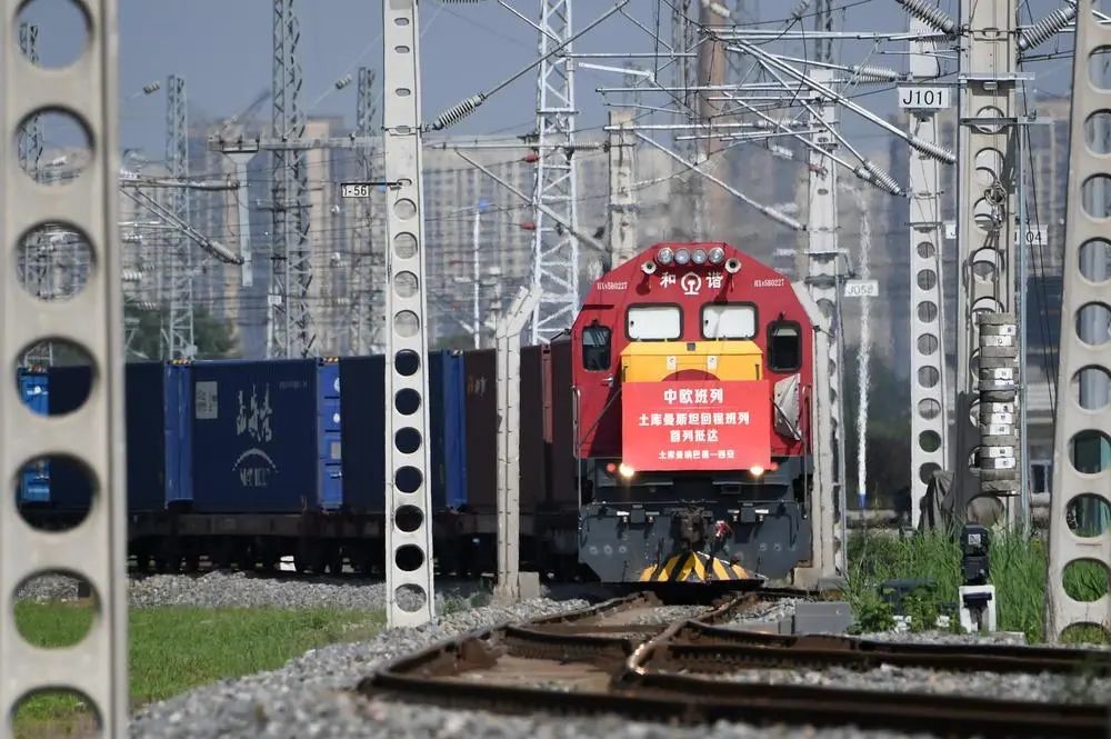 满载土库曼斯坦甘草中药材原料的中欧班列回程列车抵达西安国际港站(2022年8月31日摄)。新华社记者李一博摄