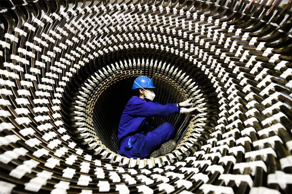 在哈电集团哈尔滨电机厂有限责任公司的生产车间,工人在进行生产作业(2022年9月3日摄)。新华社记者王松摄