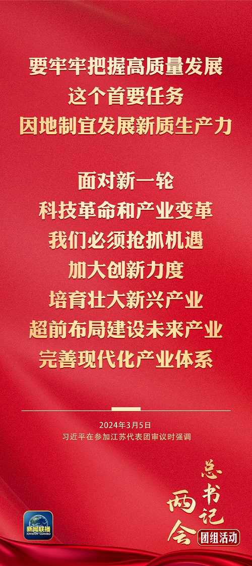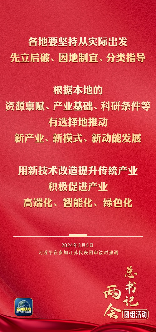 中共中央总书记、国家主席、中央军委主席习近平5日下午在参加他所在的十四届全国人大二次会议江苏代表团审议时强调,要牢牢把握高质量发展这个首要任务,因地制宜发展新质生产力。面对新一轮科技革命和产业变革,我们必须抢抓机遇,加大创新力度,培育壮大新兴产业,超前布局建设未来产业,完善现代化产业体系。发展新质生产力不是忽视、放弃传统产业,要防止一哄而上、泡沫化,也不要搞一种模式。各地要坚持从实际出发,先立后破、因地制宜、分类指导,根据本地的资源禀赋、产业基础、科研条件等,有选择地推动新产业、新模式、新动能发展,用新技术改造提升传统产业,积极促进产业高端化、智能化、绿色化。