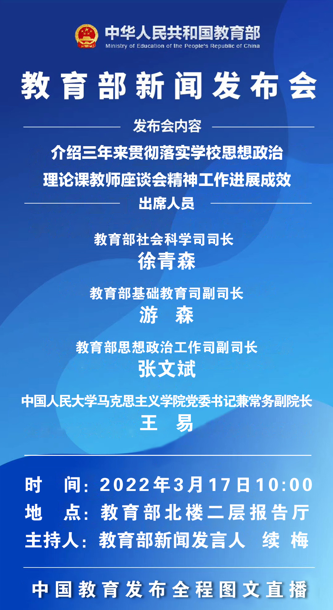 各位嘉宾,各位记者朋友,大家上午好!欢迎大家来参加教育部今天的新闻发布会。明天是3月18日,三年前,也就是2019年的3月18日,习近平总书记主持召开了学校思想政治理论课教师座谈会,并且发表了重要讲话,从党和国家事业长远发展的战略高度出发,深刻阐明学校思政课的重要意义,就如何办好新时代思政课做出部署,提出要求,为做好新时代学校思想政治工作、培养担当民族复兴大任的时代新人,提供了重要遵循。