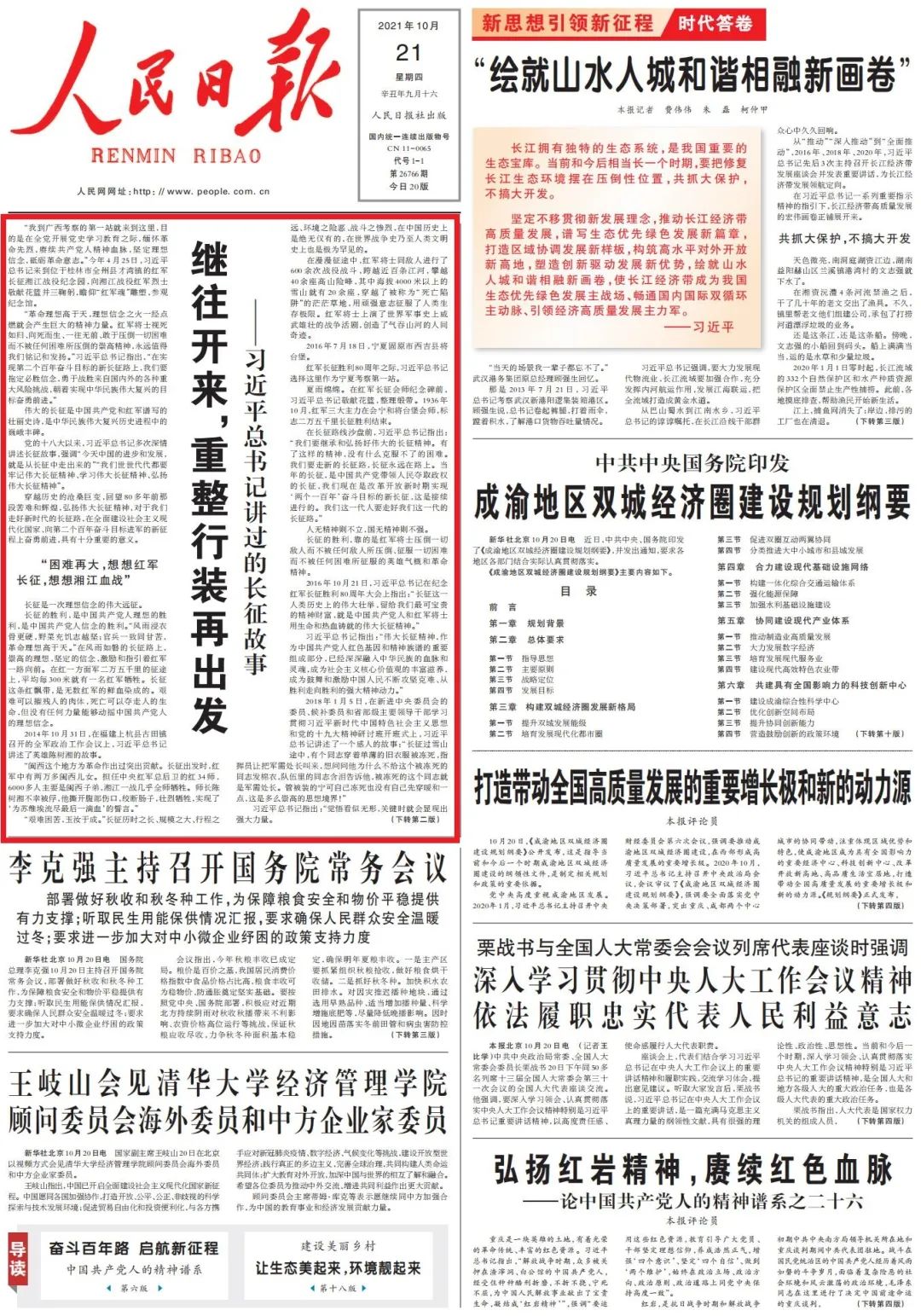 伟大的长征是中国共产党和红军谱写的壮丽史诗,是中华民族伟大复兴历史进程中的巍峨丰碑。10月21日,《人民日报》头版头条刊发报道《继往开来,重整行装再出发——习近平总书记讲过的长征故事》。