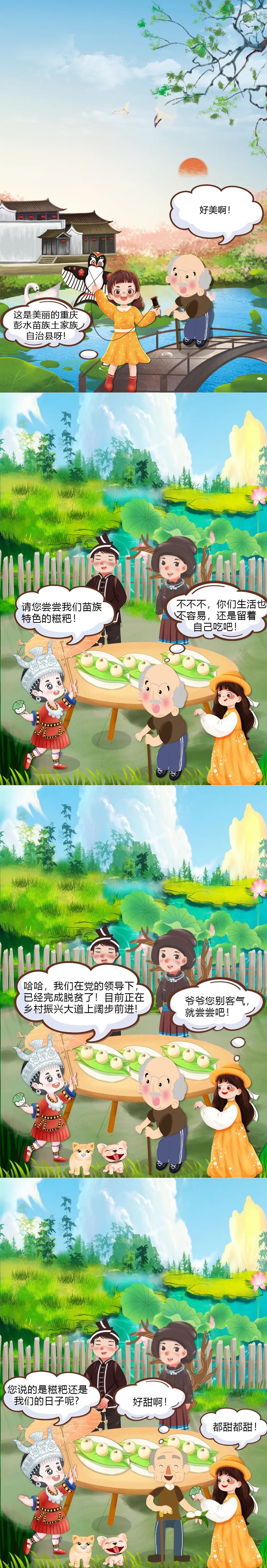 本篇漫画的灵感来源于习近平总书记在井冈山市神山村考察、打糍粑时的场景。老百姓“糍粑越打越黏,生活越来越甜”,在党的领导下,重庆彭水苗族土家族自治县成功脱贫,迈入甜蜜的生活,漫画以小见大,从民生维度见证了中国基层民众的生活发生的翻天覆地的变化,生动诠释了百年大党“为人民谋幸福、为民族谋复兴、为世界谋大同”的伟大抱负和实践。漫画在展现风俗人情的同时,还将重庆彭水苗族土家族自治县作为画面背景,突出表现了“绿水青山就是金山银山”,体现了中国既有现代文明的繁荣,也有生态文明的美丽。