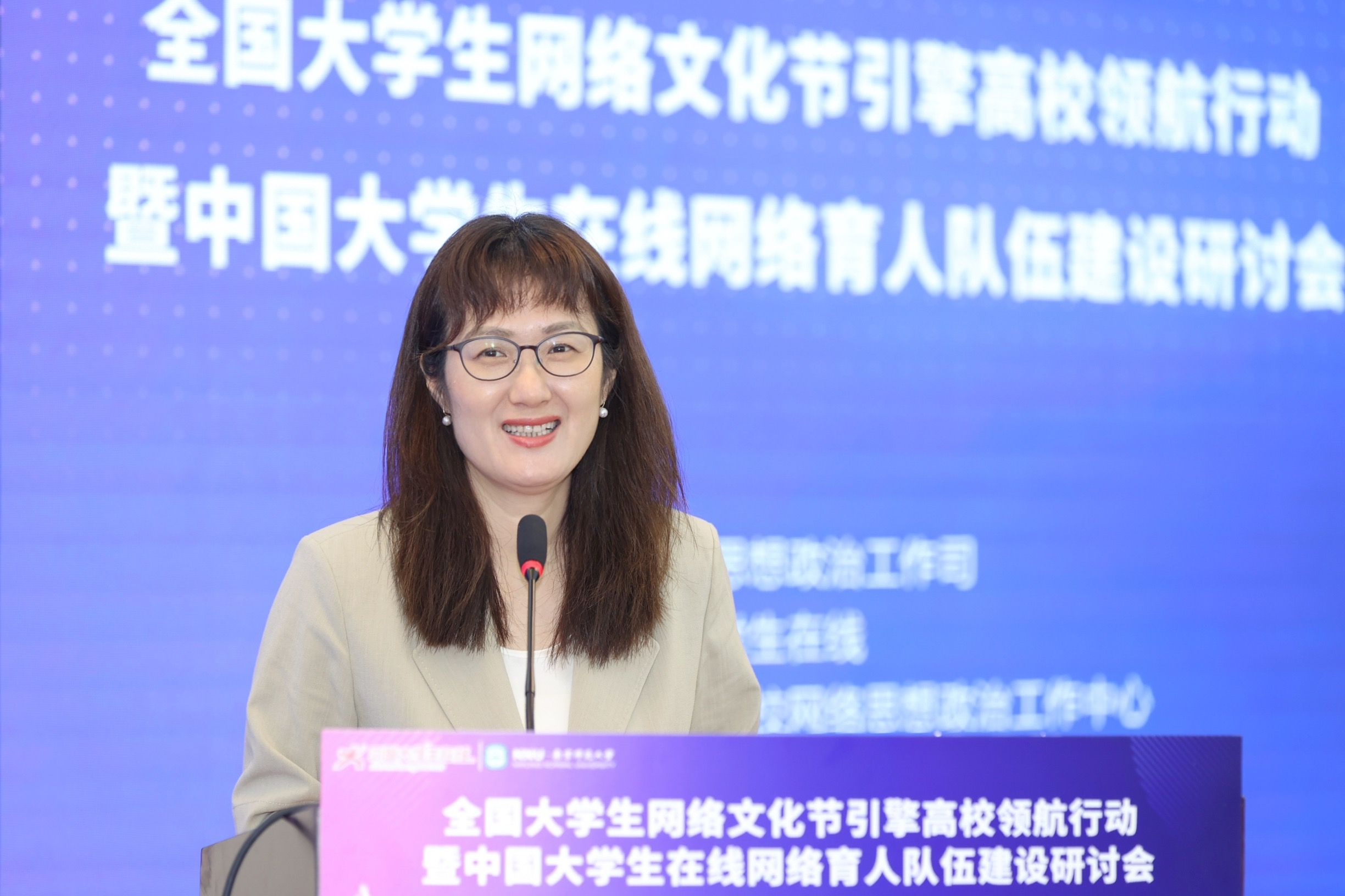 7月14日,以“网聚青春正能量 绽放创意新梦想”为主题的全国大学生网络文化节引擎高校领航行动暨网络育人队伍建设研讨会在南京师范大学举行,教育部思想政治工作司副司长孙芙蓉,江苏省教育厅二级巡视员崔春霞,南京师范大学党委副书记孙友莲,中国大学生在线、全国高校思政工作网主任王卫权出席,学校作为省级高校网络思政中心和全国大学生网络文化节引擎高校代表,与其余31个省级高校网络思政中心、27所引擎高校、中国大学生在线校园网络通讯站高校和新媒体共建高校的160余名代表共同参会。