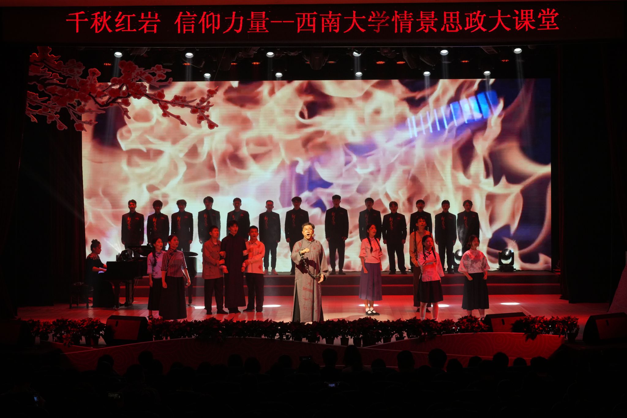 本次情景思政大课堂共分为《雾都明灯》《弥天大勇》《烈火中永生》《红岩精神永流传》四个篇章。思政大课堂在马克思主义学院副教授武鹏的生动讲述中拉开帷幕,与在场观众一同回溯了在党中央的领导下,以毛泽东、周恩来同志为代表的中共中央南方局老一辈无产阶级革命家、共产党人和革命志士,在抗日战争和解放战争初期,燃烧自己,照亮黑暗,形成红岩革命精神的光辉历程。《沁园春•雪》以青年之朝气,歌颂先辈不畏艰苦、朝夕为国的铮铮誓言,激励青年厚植家国情怀,勇担时代重任;《红旗颂》以绣红旗为引,以古典舞表达了对革命岁月的深情礼赞;《我的自白书》用真挚饱满的情感、铿锵有力的朗诵向伟大的革命先烈致敬,鼓舞青年坚定理想信念,以英雄为模范,团结奋进、砥砺前行……大课堂为全校师生带来了一次精神洗礼,赢得在场师生阵阵掌声。