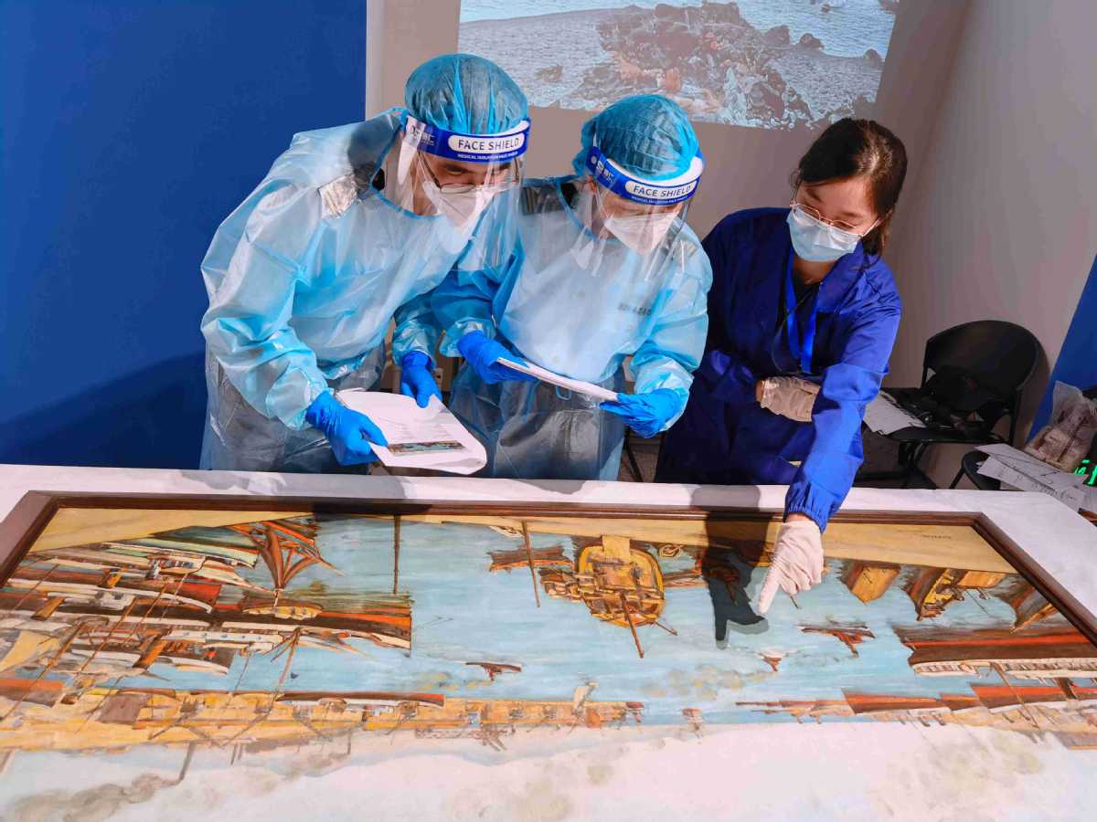 An oil painting depicting a scene from the Greek port of Piraeus in 1934 is examined on a table on July 12, 2022, at the Shanghai Museum. The Thalassa: The Sea in Greek Art from Antiquity until Today exhibition displayed 45 cultural items provided by the Greek government. HE YI/FOR CHINA DAILY