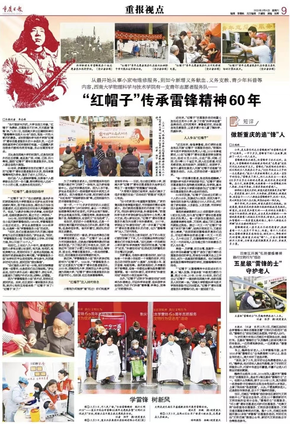 雷锋精神永不褪色,向雷锋学习永不过时。在重庆,与雷锋精神内涵相通共鸣的是“志愿者”这张闪闪发光的城市名片。雷锋说:“把有限的生命投入到无限的为人民服务之中去。”2022年抗击山火中的一名志愿者说:“能为人民贡献绵薄之力,是我一直坚守的信念。”雷锋走了很久,但又从未远去——重庆620多万名实名注册的志愿者,就是你我身边的雷锋。在今天,致敬雷锋,也致敬每一个如雷锋般为他人奉献、为城市奉献、为国家奉献的普通人。
