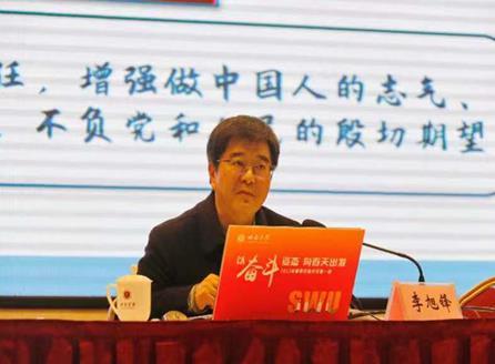 李旭锋指出:“融入时代,才能把握时代,每一代青年人都有自己的时代际遇,都要在所处的时代谋划人生、创造未来”,他希望青年学子对话时代,用事实涤荡迷雾与彷徨。面对世界百年未有之大变局、中华民族伟大复兴进入关键时期,国际国内挑战重重,青年学子要看得懂形势、树得起信心、担得起使命,让迷雾被涤荡、脚步更有力,意气风发迈上全面建设社会主义现代化国家新征程,以中国式现代化全面推进中华民族伟大复兴;传承精神,用担当交汇光荣与梦想。李旭锋从阐释精神之于民族和国家的重要意义入手,列举了中华民族的担当与气节、西大师生用行动诠释的伟大抗疫精神,希望同学们“从精神中汲取真理力量、实践力量、人格力量、智慧力量,传承红色基因,激扬精神的力量,继续奔跑,让担当交汇成为青春标识”;勇敢进取,用奋斗激扬青春与人生。李旭锋在讲述中展示了伟大祖国的强大实力,生发出背后奉献无悔青春的广大青年的励志故事,以此告诫青年学子“奋斗是青春最亮丽的底色,行动是青年最有效的磨砺”。