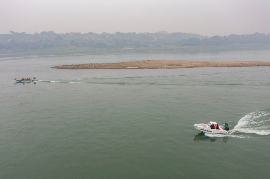 2023年2月7日,鸿鹄护鱼志愿队队员在长江重庆江津段巡护(无人机照片)。新华社记者黄伟 摄