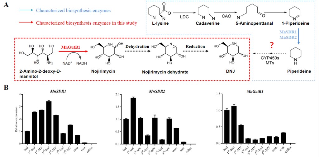 该研究揭示了由脱氢酶MnGutB1参与催化的糖衍生DNJ生物合成分子机制,是桑树DNJ合成机理解析的重大进展。