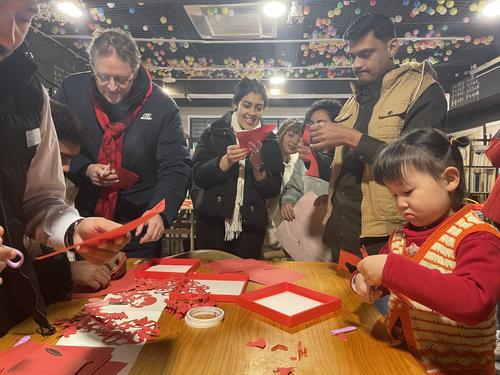 包完饺子,留学生们还感受了写“福”字和剪窗花。提起金色毛笔“照猫画虎”,沿着画线边缘小心翼翼地剪纸。大家在“动手”的过程中感受中国民俗活动的趣味和中国文化。