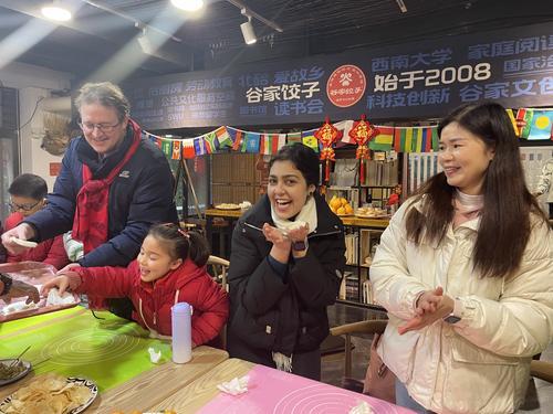 ▲留学生们体验包饺子。记者何春阳摄/视觉重庆