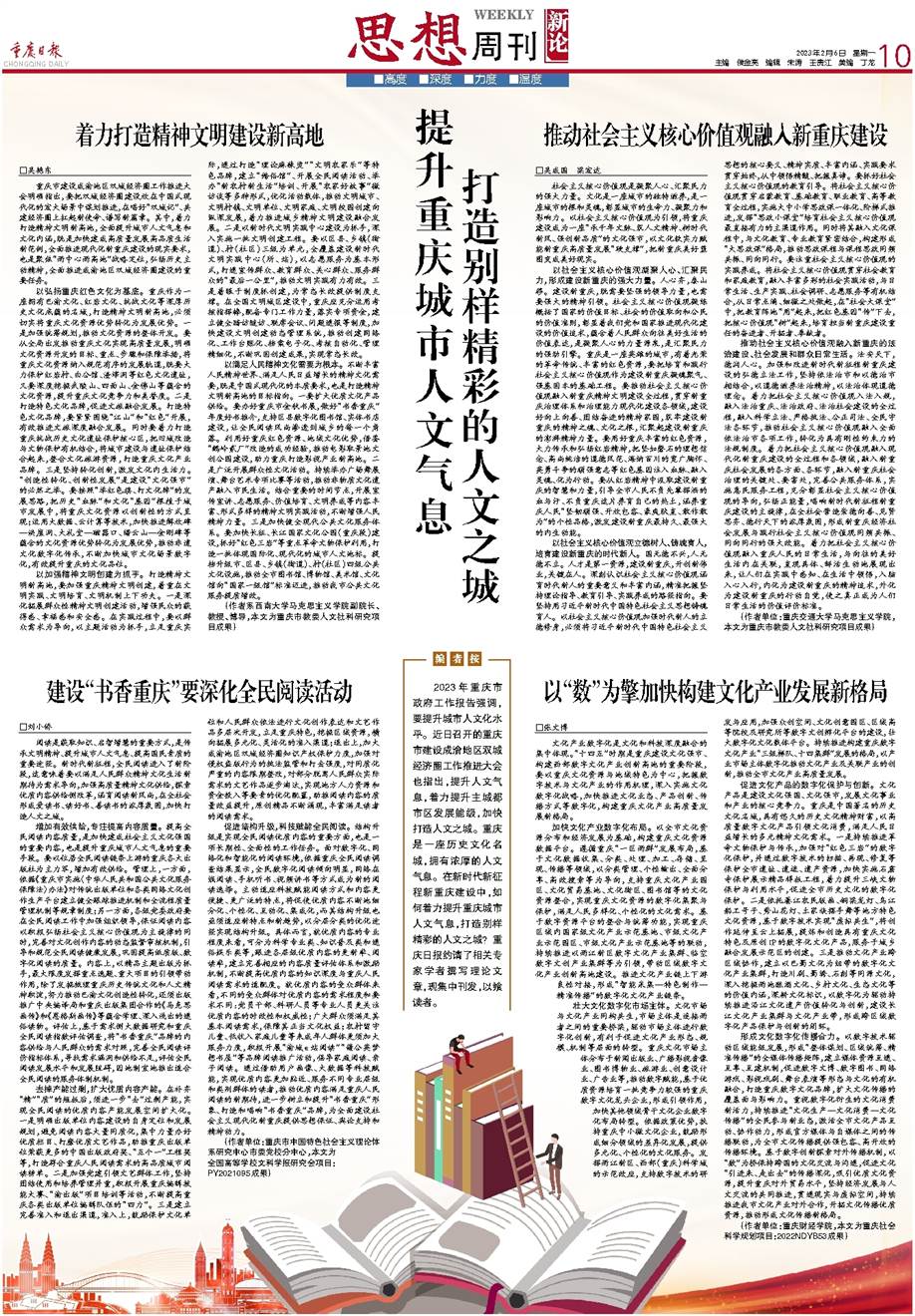 2023年重庆市政府工作报告强调,要提升城市人文化水平。近日召开的重庆市建设成渝地区双城经济圈工作推进大会也指出,提升人文气息,着力提升主城都市区发展能级,加快打造人文之城。重庆是一座历史文化名城,拥有浓厚的人文气息。在新时代新征程新重庆建设中,如何着力提升重庆城市人文气息,打造别样精彩的人文之城?重庆日报约请了相关专家学者撰写理论文章,现集中刊发,以飨读者。