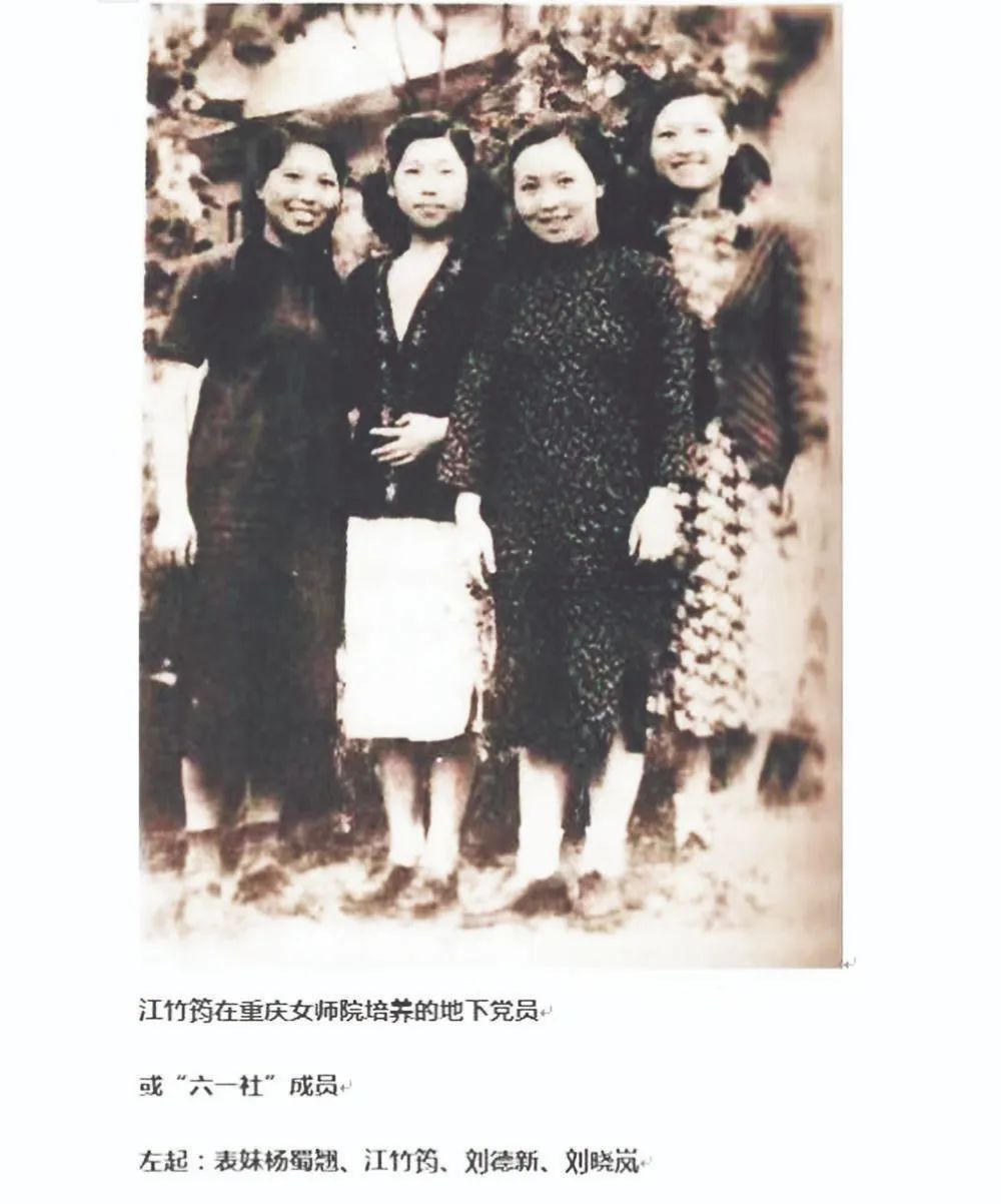 而这张照片注释中明确指出:江姐在重庆女师院培养的地下党员或“六一社”成员,左起江姐的表妹杨蜀翘、江竹筠、刘德新、刘晓岚。透过这张发黄的黑白老照片,不难看出,江姐确实是小说《红岩》、电影《烈火中永生》以及歌剧《江姐》等作品中描绘的那种经典形象:个头不高,身材娇小,穿旗袍,外套薄毛衣开衫,面相和蔼,笑容可掬,还透出一种温存而干练的气质。几位女大学生也像今天“追星族”般,笑得十分开心。