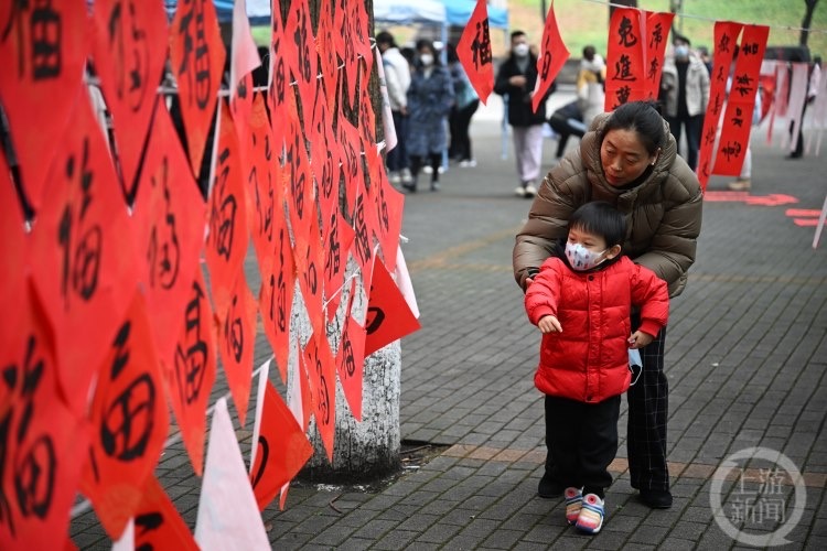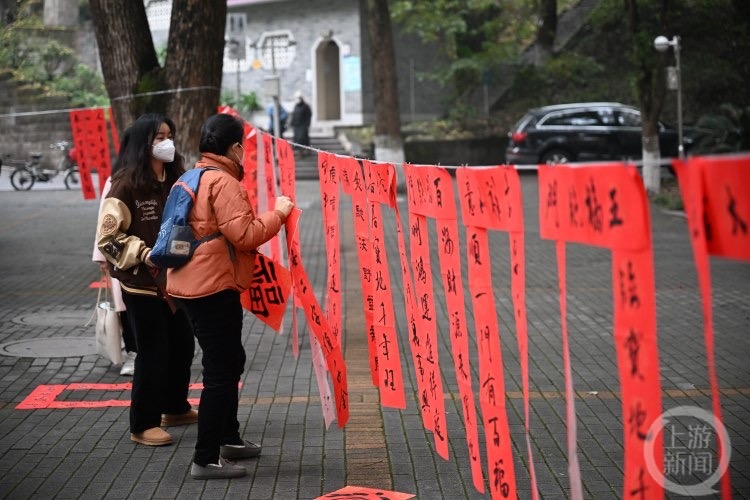 “上联:一帆风顺吉星到,下联:万事如意福临门,横批:财源广进。”美术学院师生们写好的一幅幅春联被挂在校园树木间系好的绳子上,组成了一面喜庆的“春联墙”。书法专业的研究生们把几十种不同的“福”字挂在一起,组成了一面“祝福墙”,形成了校园里一道亮眼的风景。