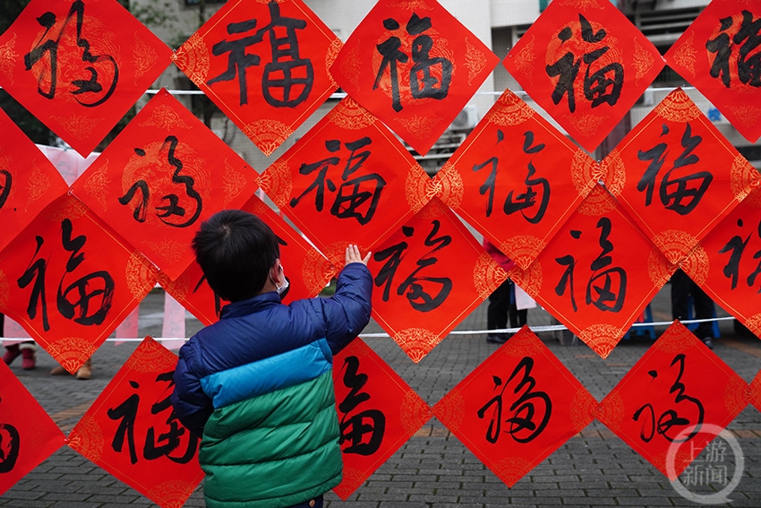 小男孩在选取自己喜欢的福字。