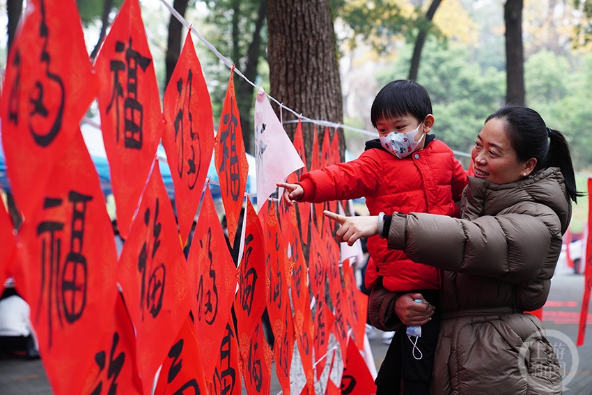 家长带着孩子在选取自己喜欢的福字。