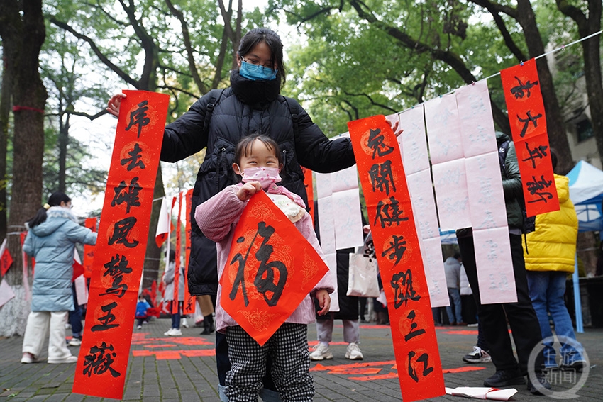 家长带着孩子在领取新春对联。