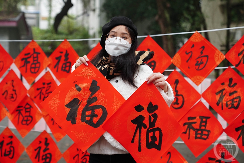 一名大学生在展示福字。