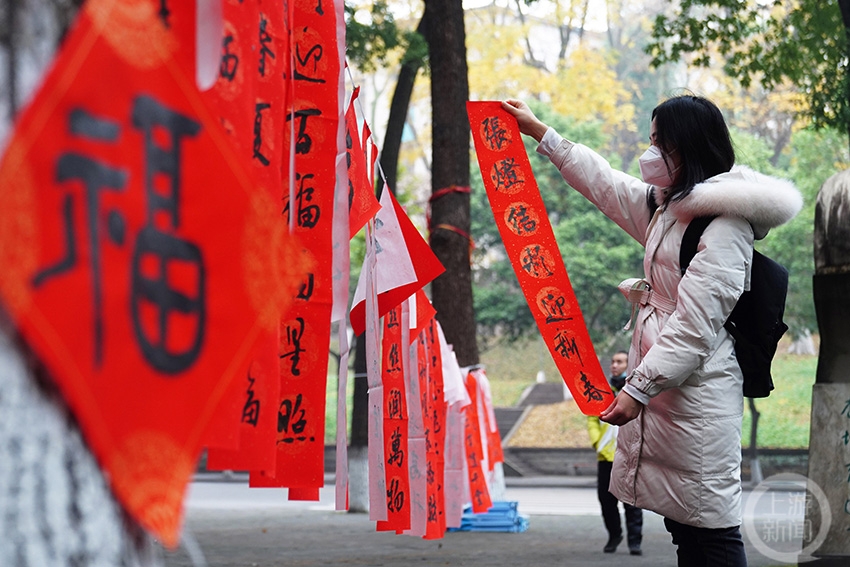 一名大学生在选取自己喜欢的春联。
