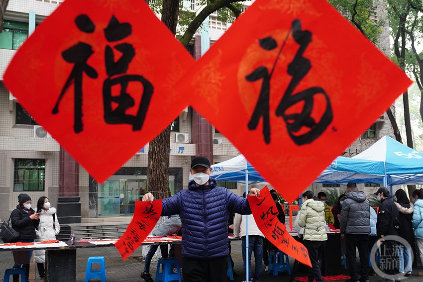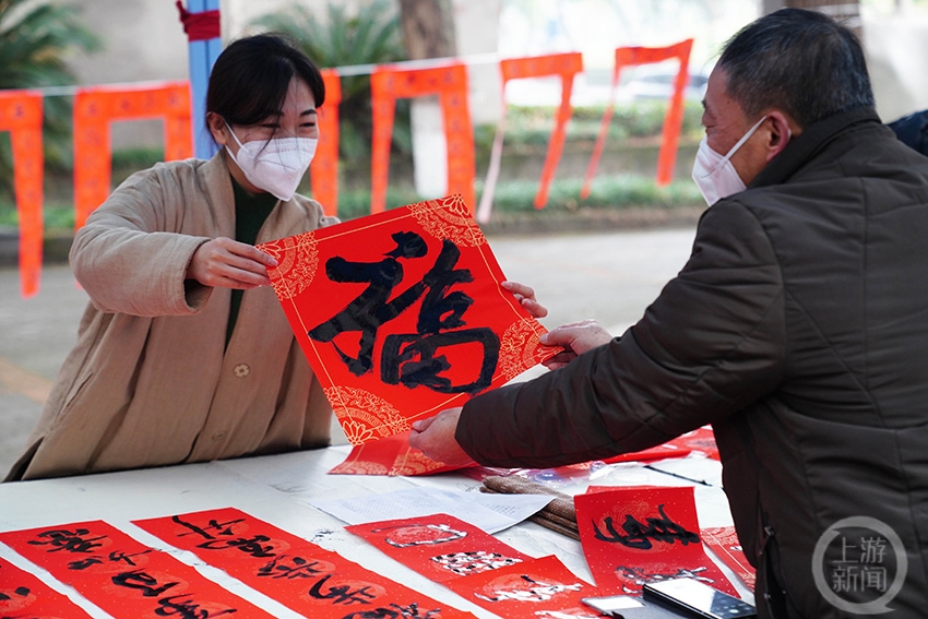 美术学院的学生在给市民赠送福字。