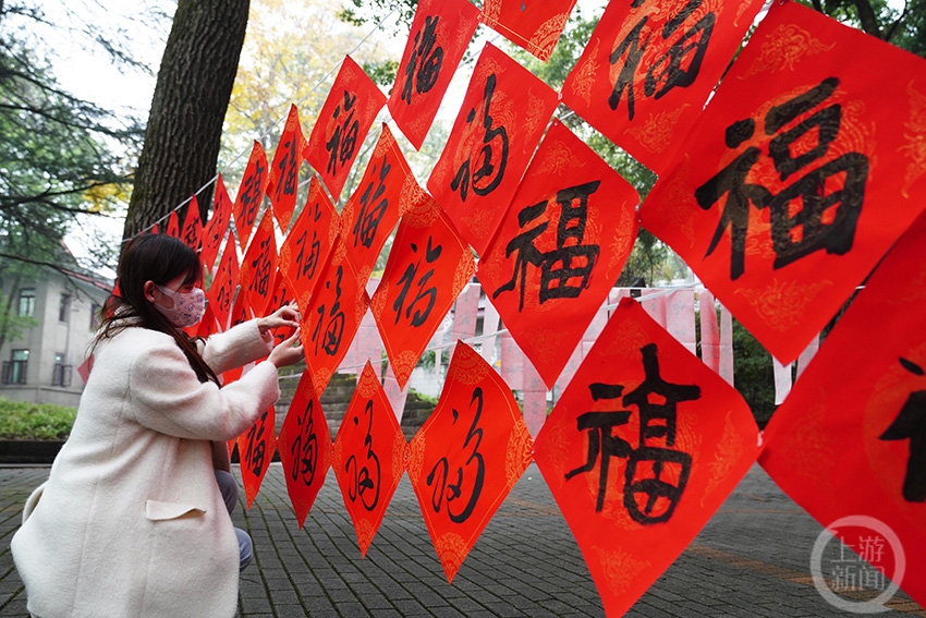 一名美术学院的学生在悬挂福字。
