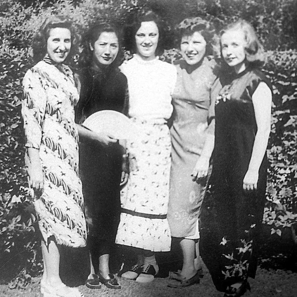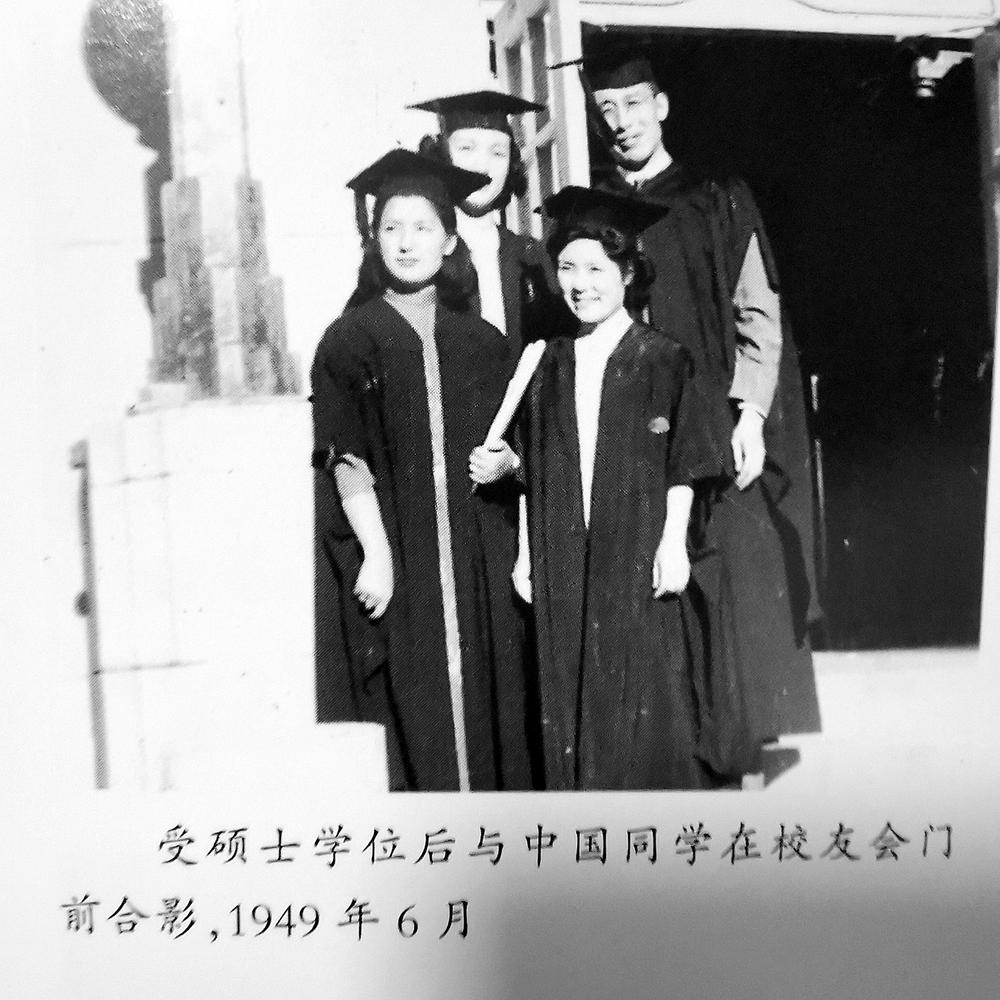 1949年6月,刘佩瑛(左一)获受硕士学位后与中国同学在校友会门前合影。