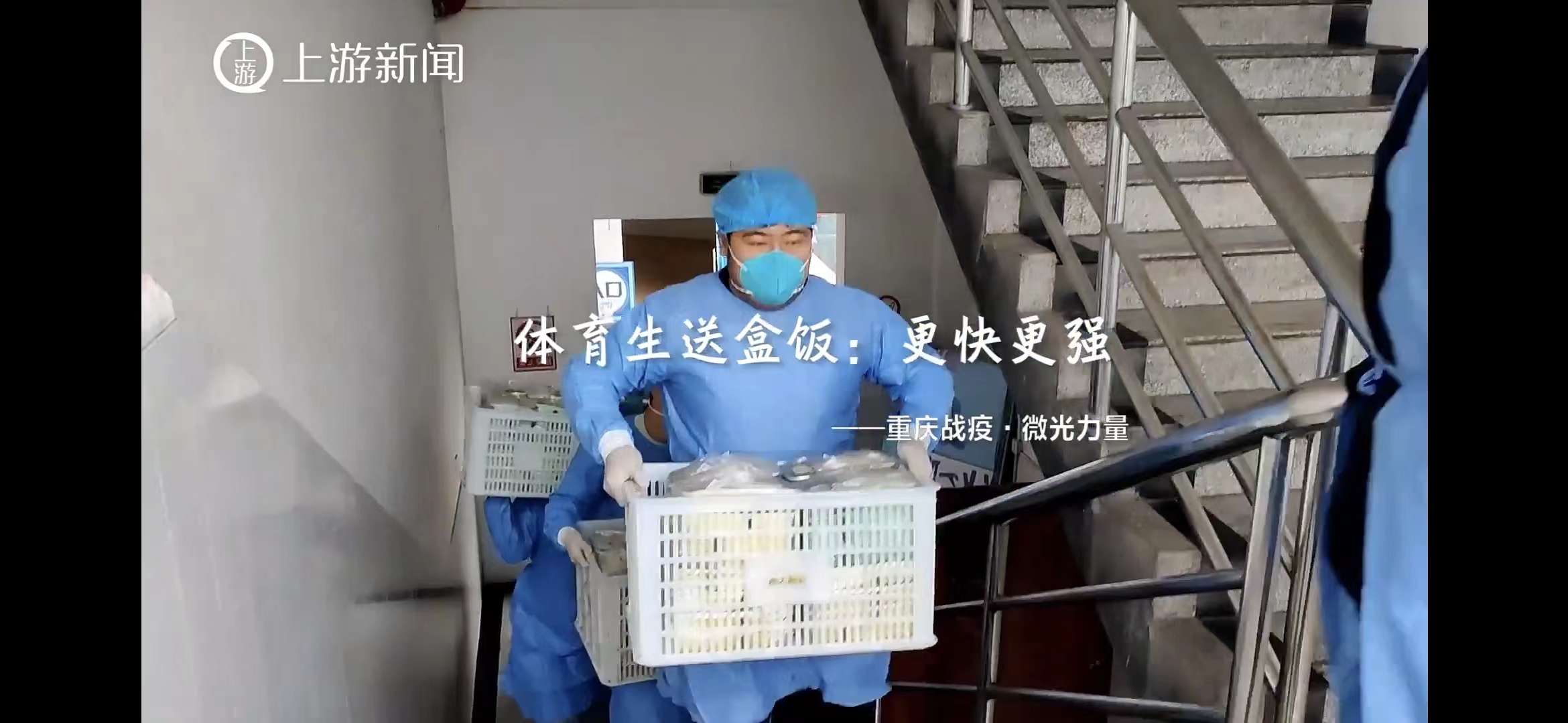 在这些志愿者当中,有一名同学格外引人注目。大高个子大块头的王浩宇,是betway88西汉姆联体育学院2019级运动训练专业的学生,还是重庆市铅球纪录保持者。王浩宇称,每天上午10点半,他和同学们都会来到学校橘园食堂。穿好防护服,做好上岗前的安全检查后就投入工作。他们首先从橘园二楼将盒饭打包装箱,搬运上三楼,再逐箱装车。三小时的时间,需要完成近8000份盒饭,让封控在寝的学生吃到了热饭。