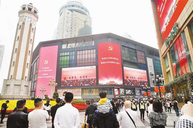 ▲10月23日,解放碑LED大屏幕前,市民们正在观看二十届中共中央政治局常委同中外记者见面会直播。特约摄影 钟志兵/视觉重庆
