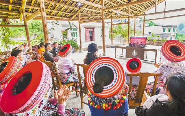 ▲10月23日,綦江区安稳镇上坝村,党员干部与当地苗族同胞收看二十届中共中央政治局常委同中外记者见面会直播。特约摄影 陈星宇/视觉重庆