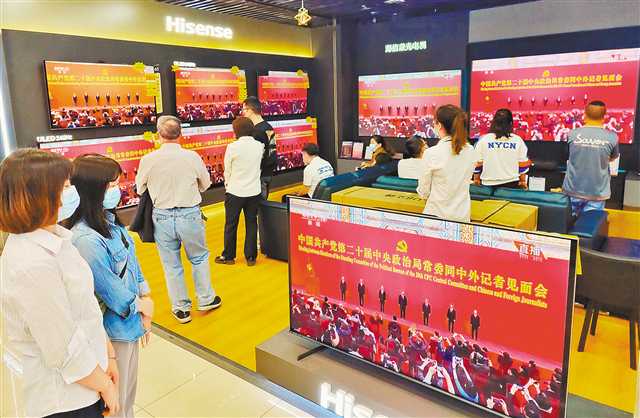 ▲10月23日,江北区观音桥步行街,市民在商场内观看二十届中共中央政治局常委同中外记者见面会直播。记者 崔力 摄/视觉重庆