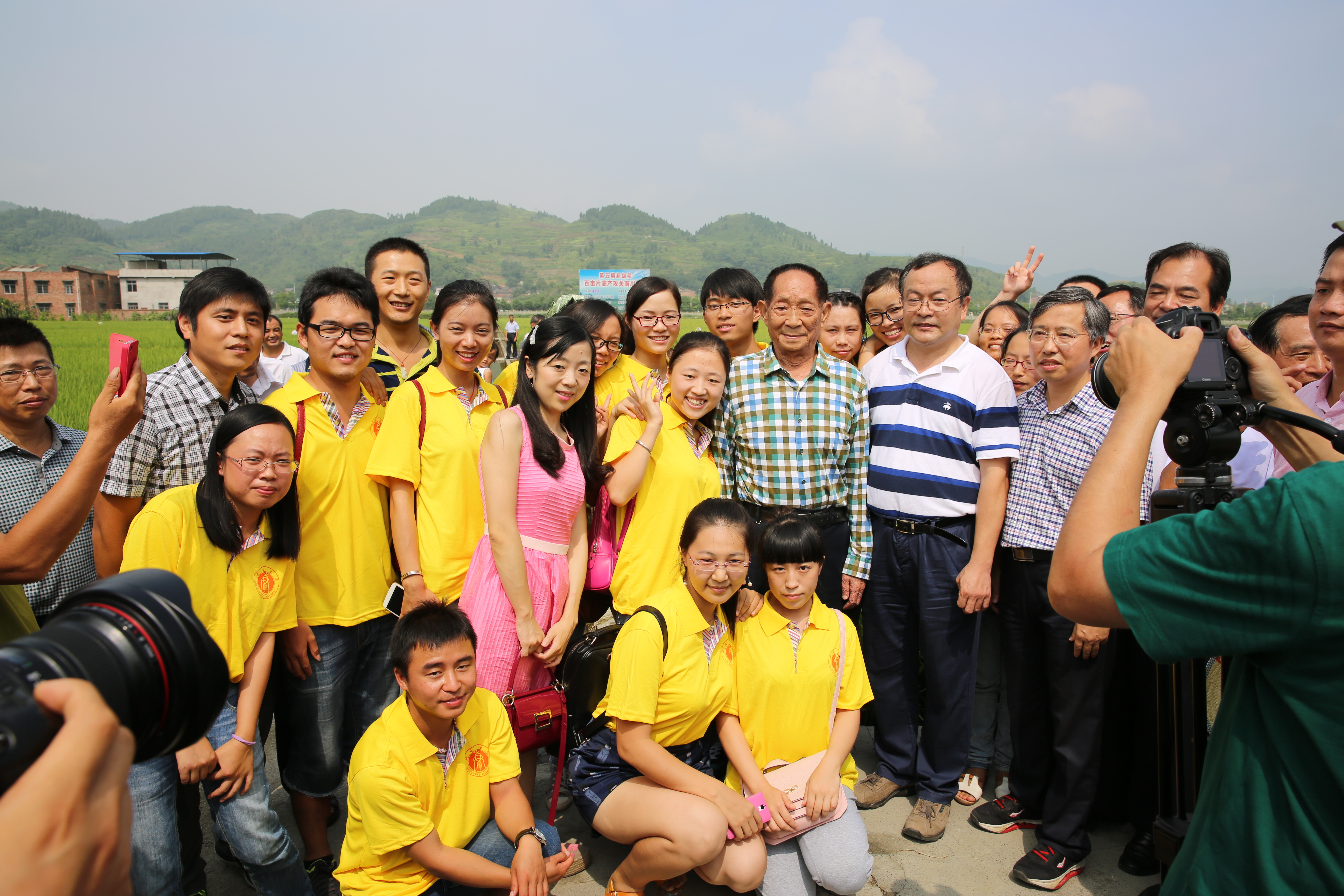 2015年8月袁隆平在重庆南川超级杂交稻实验基地考察,和师生在一起。