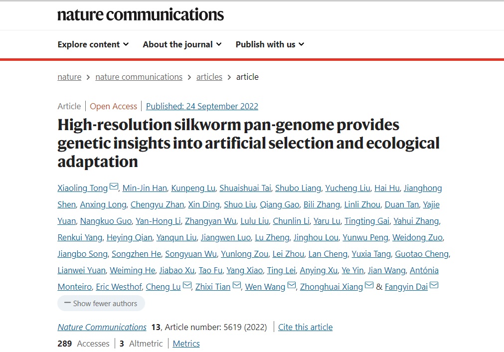 On Sept 24, a thesis written by the laboratory — "High-resolution silkworm pan-genome provides genetic insights into artificial selection and ecological adaptation" — was published in Nature Communications, a peer-reviewed, open-access scientific journal of Nature Portfolio established in 2010. It publishes high-quality research in natural sciences, including physics, chemistry, earth sciences, medicine and biology.
