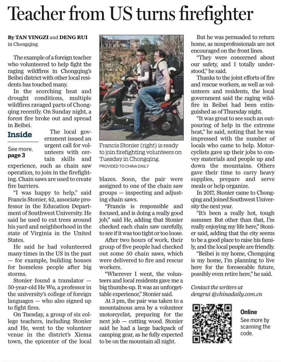 【China Daily】Teacher from US turns firefighter
