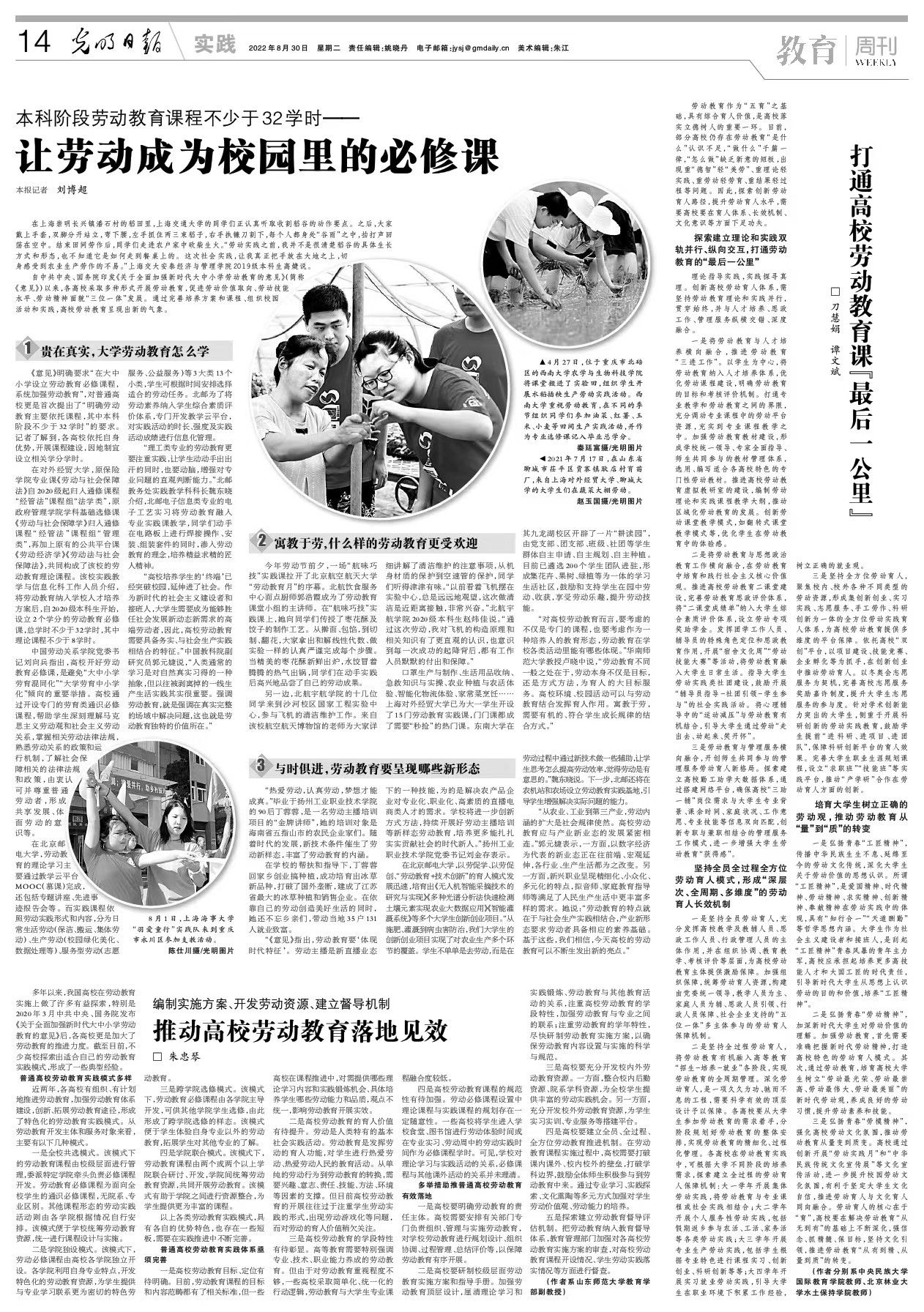 “高校培养学生的‘终端’已经突破校园,延伸进了社会。作为新时代的社会主义建设者和接班人,大学生需要成为能够胜任社会发展新动态新需求的高端劳动者,因此,高校劳动教育需要具备务实、与社会生产实践相结合的特征。”中国教科院副研究员郭元婕说,“人类通常的学习是对自然真实习得的一种抽象,但以往被剥离掉的一线生产生活实践其实很重要。强调劳动教育,就是强调在真实完整的场域中解决问题,这也就是劳动教育独特的价值所在。”