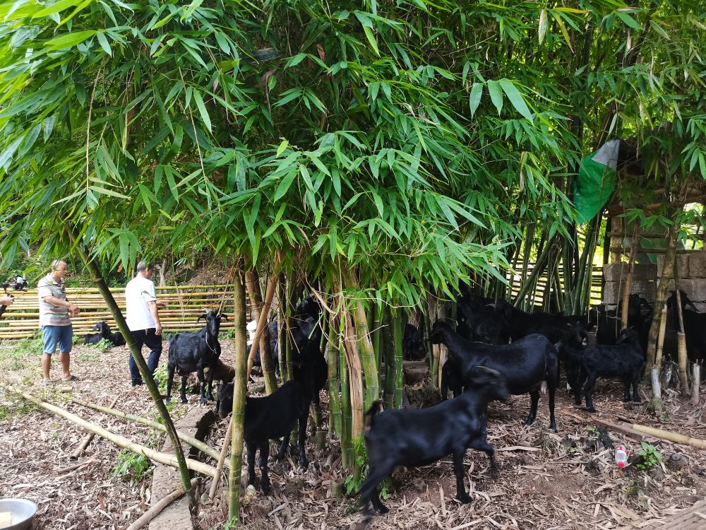 图说:7月6日,大足区铁山镇双桥村脱贫户郑应成饲养的大足黑山羊在竹林下活动。新华社记者 周思宇 摄