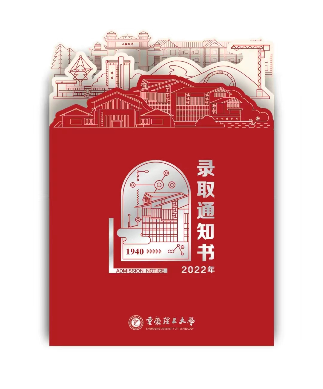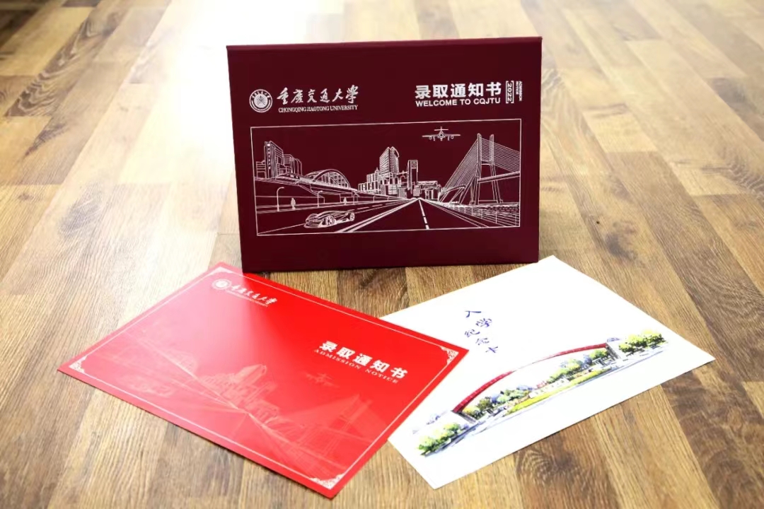 重庆交通大学录取通知书底色以“交大红”为基调,庄重且喜庆,封面是一幅上天入地、穿山跨江的重庆特色交通图。