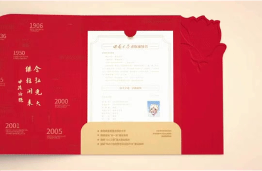 四川外国语大学的录取通知书以博士服的构图和色彩搭配为设计理念,彰显川外本硕博一站到底的办学实力。