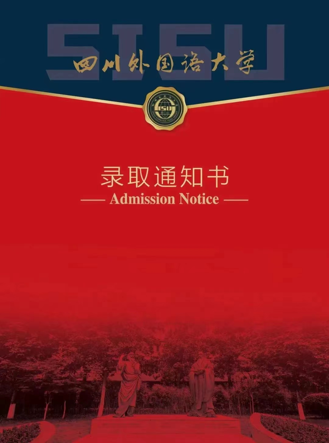 通知书以校园景观“中西方文明跨越时空的对话”雕塑作品为底,中国先秦哲学家孔子和古希腊哲学家柏拉图跨越时空“对话”。