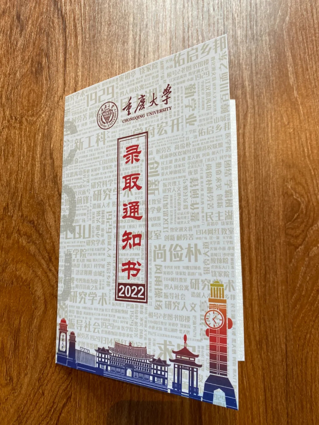 重庆大学的录取通知书采用传统书籍设计样式,与正红色的重大标志组合,彰显庄重与正式。底纹由重庆市和重庆大学的代表性关键词组成,寓意这座城市孕育重庆大学,学校反哺社会,两者的高速发展密不可分。