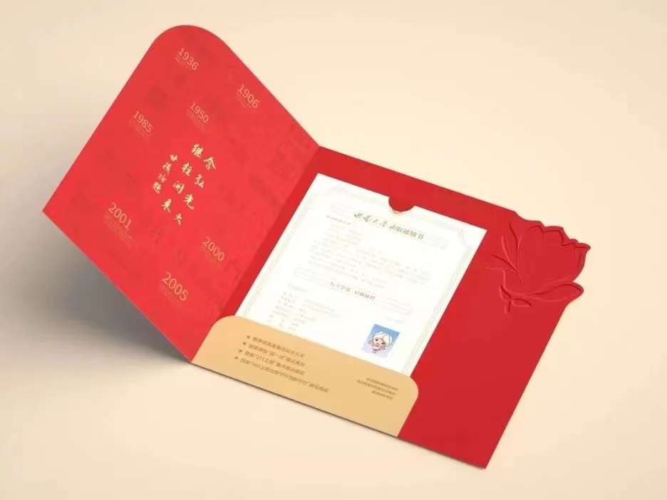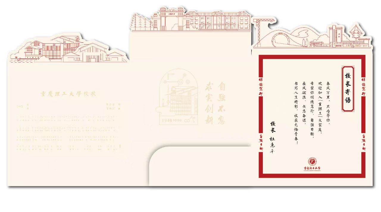重庆理工大学的通知书采用具有仪式感的三折页式,让新生拆开通知书的包裹时,更具仪式感。