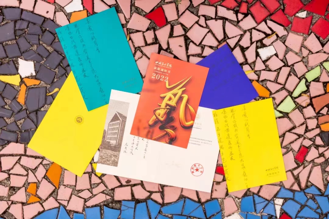 录取通知书的装帧设计采用对折的形式,正反四页,打开左页为四川美术学院庞茂琨院长为新生手写寄语,饱含祝福、情感、责任与理想,结合学校标志性建筑图书馆的图像,呈现强烈人文感与真实感。封套为完整包裹通知书的信封,强调仪式感与保护功能,采用黄、蓝、绿三种有色特种纸,信封色彩随机分布,不同色彩对应了个性化的心理,增强认同感。