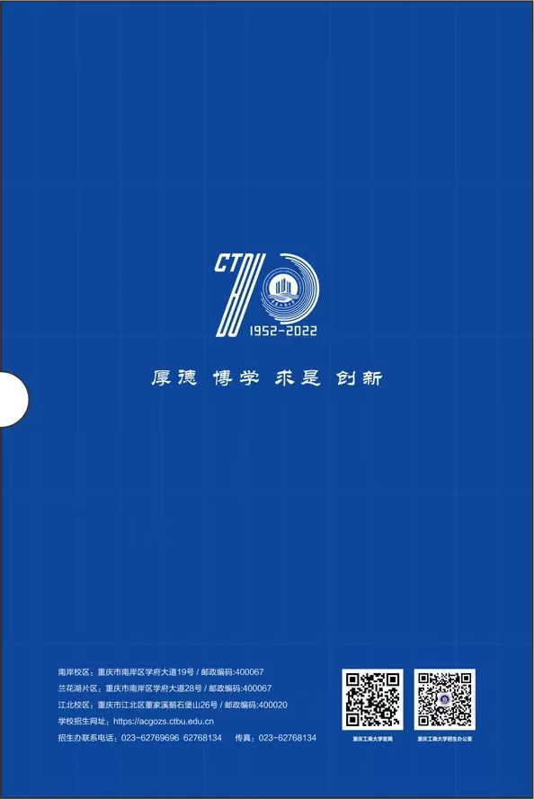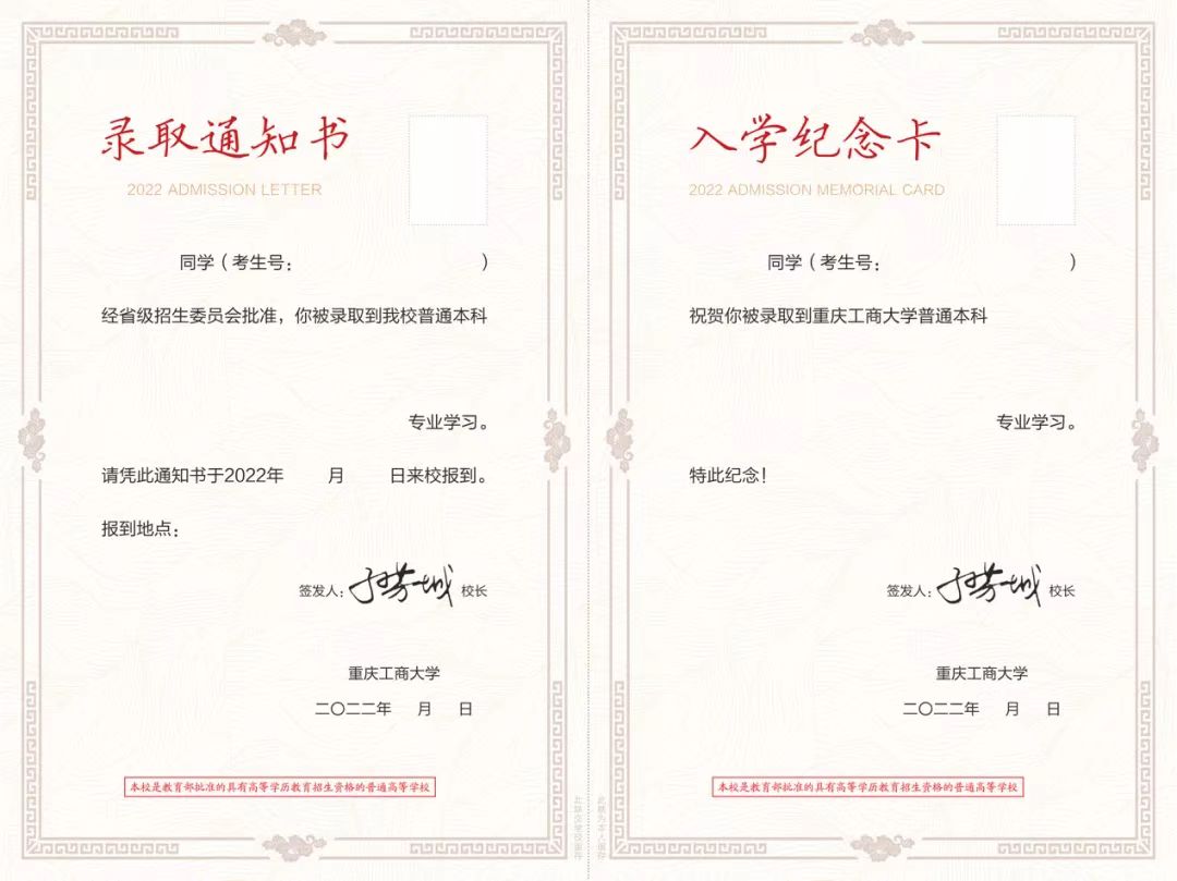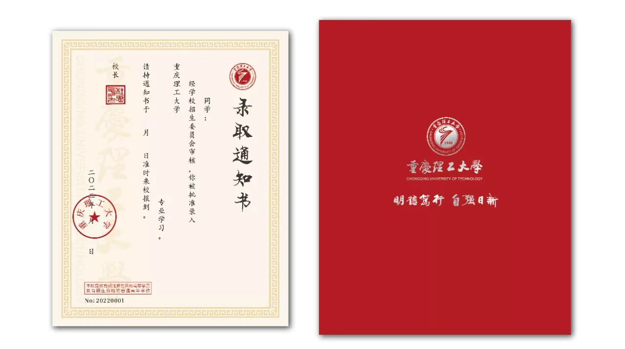 通知书背面为重庆理工大学校徽和校训,校徽图案如一只展翅翱翔、奋勇腾飞的大鹏搏击长空,象征着每一位重庆理工大学学子,展示了学校“自强不息、求实创新”的奋进精神。