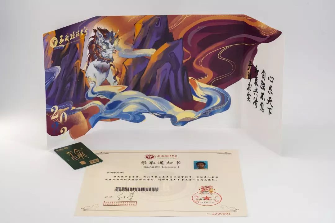 今年,西南政法大学的录取通知书首次采用礼盒包装,通知书封面的校徽、校名部分采用烫金工艺彰显大气,封舌印有“博学笃行 厚德重法”的学校校训字样。