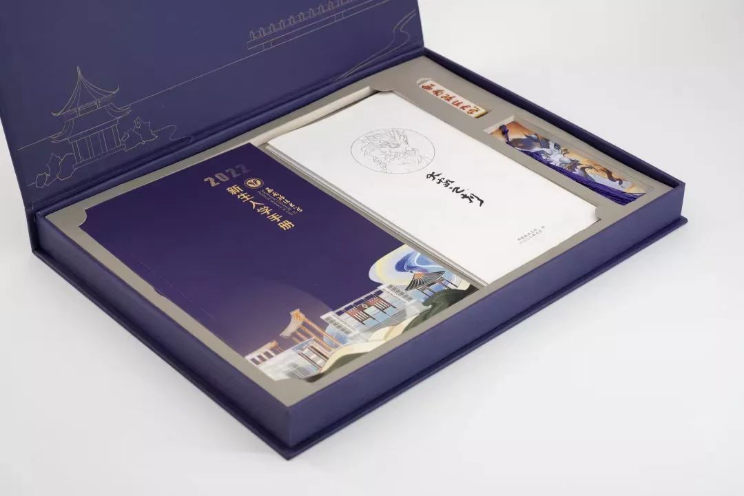 盒内还附赠书签和西南政法大学学生校徽,书签两面均为通知书所使用原画,与校徽可一同取下,新生们可佩戴校徽到校报到。