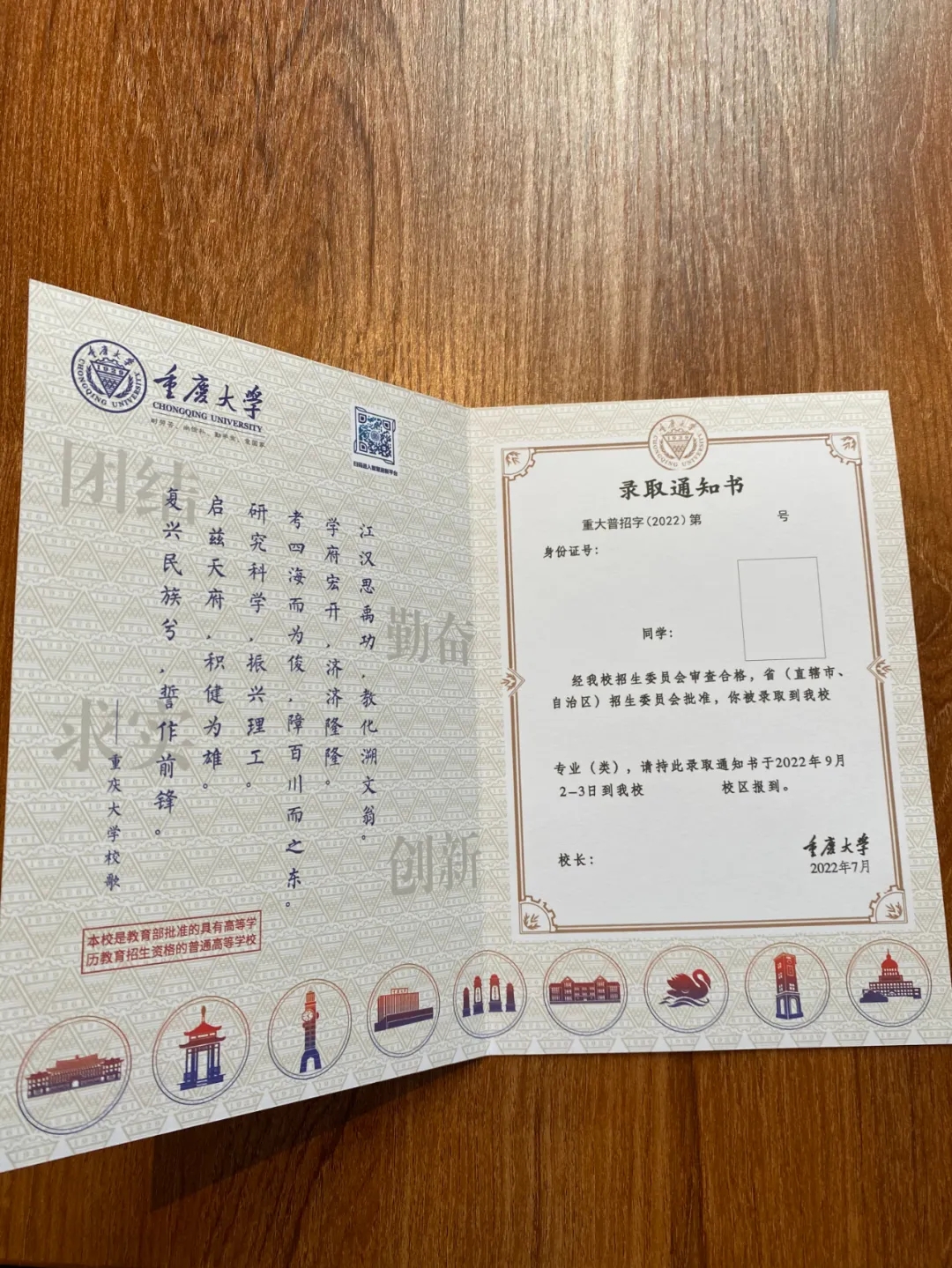 通知书的内页,不仅有重庆大学校歌、校徽,页脚还印上了代表重庆大学的特有建筑与标志,充分展现了重大的特色。底纹印上了“团结、求实、创新、勤奋”八字校风,表达了重大对新生未来学习生活的祝福与期望。