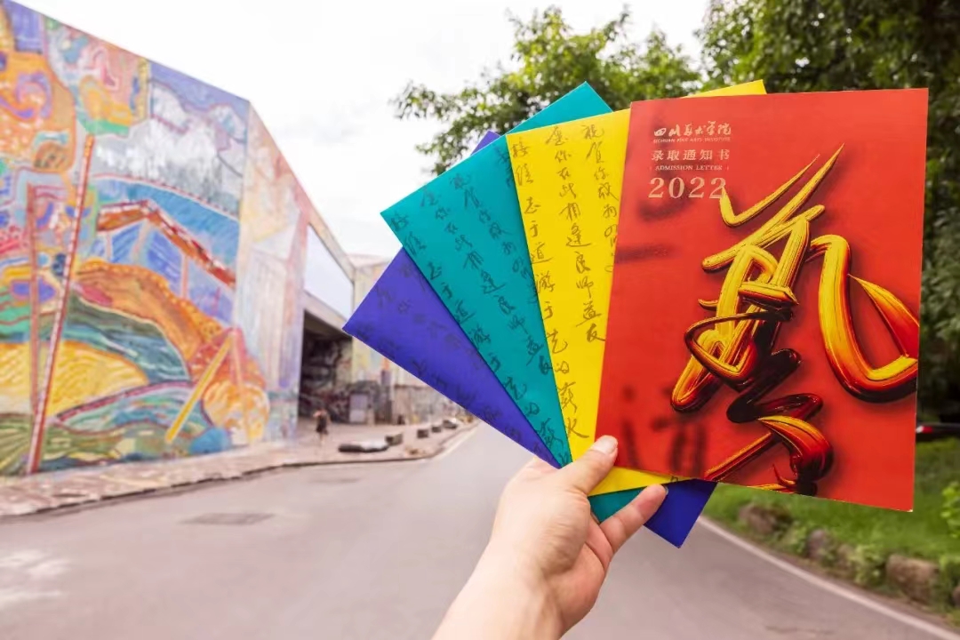 “艺”作为了四川美术学院录取通知书的主体视觉元素,以草书为原型,以颜料质感予以立体造型的手法,校训的其他文字以隐约的投影出现,塑造空间中的文字意向,体现信息智能时代虚拟时空的艺术形式特征。